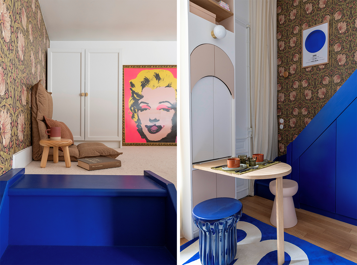 パリらしい共同住宅の1階にある、コンシエルジュの管理人室。たった16平方メートルの空間がロフト付きの住まいに生まれ変わった。改装を手がけたのは、内装建築家のニコラ・パイエ。ポイントは、彼のシグネチャーである色使いに加え、自然光を生かす工夫だった。