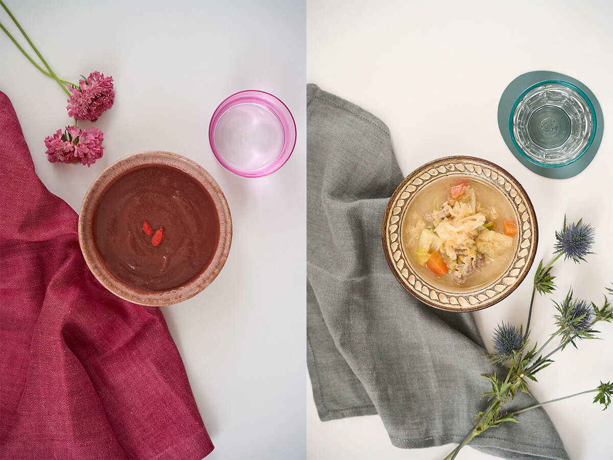 左:ビーツとクコの実の美活ポタージュ 右:カラダうるおす 白きくらげの白味噌豚汁 各180g ¥900、300g ¥1,700(ともに5/28発売)