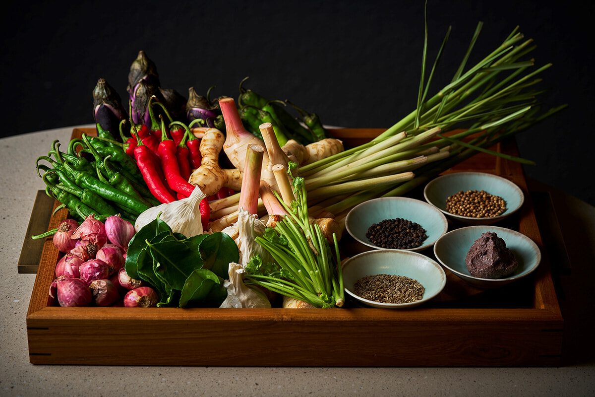 コースの始まりは目の前で石臼を使って食材をすりつぶして料理を仕上げるアミューズブーシュ。それを食べた瞬間に、気分はもうタイ。コース内容は時期によって替わりますが、訪れたこの日は「ナンプラーでマリネしたスイカとトマトレリッシュ」「鱧のスチーム ココナッツクリームとガーリックの酢漬け」など、爽やかな味わいからスタートしました。
