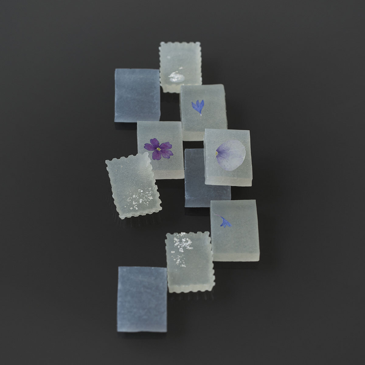 和菓子作家でありグラフィックデザイナーでもある藤原夕貴が手がける、花々からの手紙をテーマにした切手型の琥珀糖。ラベンダーを基調とした花の香りや梅の味わいを閉じ込め、一口ごとにはじける香りがうつろいゆく季節を告げる。大切な人へ贈りたい。