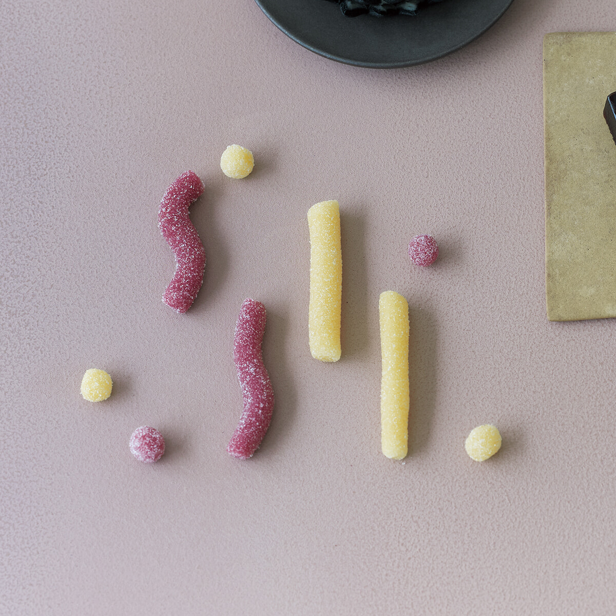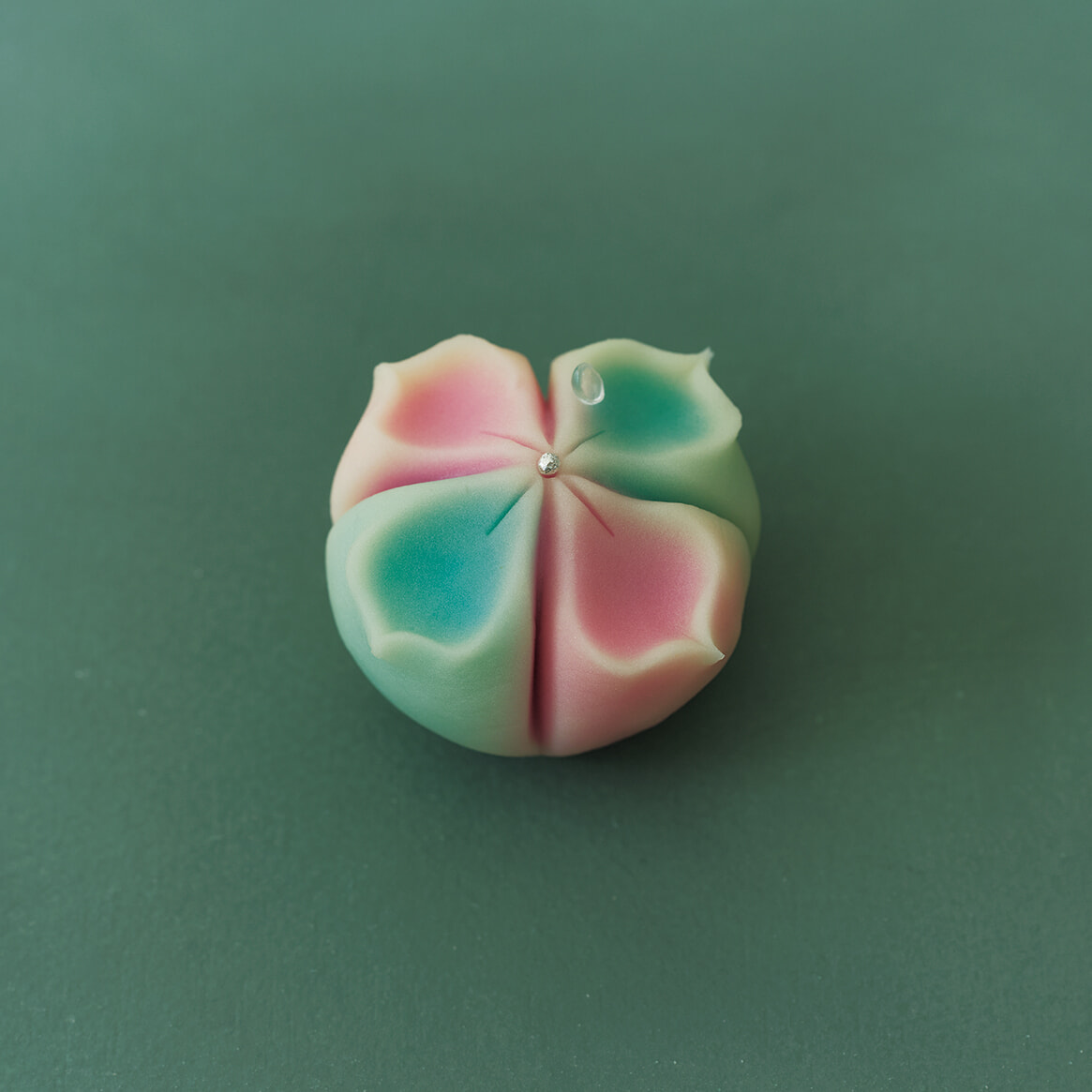 創業100年を超える香川の老舗和菓子店、御菓子司 寳月堂の若手女性職人とのタッグ。和三盆糖の上品な甘さと果実のみずみずしさを閉じ込めた生落雁。杏にはオレンジゼスト、サワーチェリーにバラを合わせ、口の中でシャリッと優しくほどける。