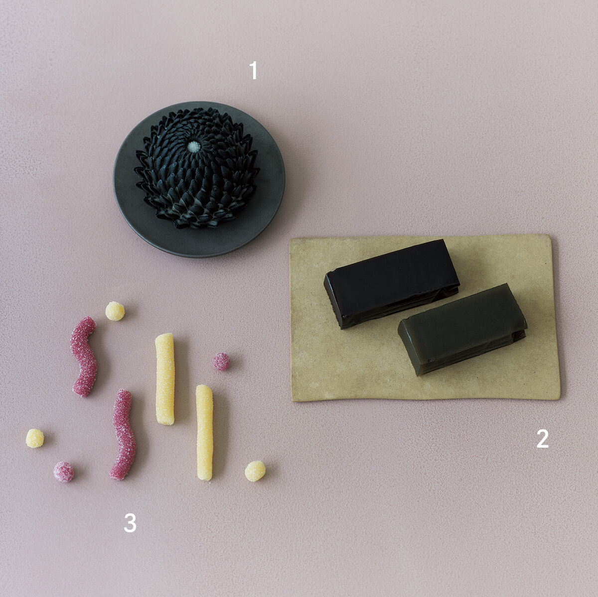 2024年アジアベストパティシエに選ばれたファロの加藤峰子と、日本各地の和菓子職人との技の融合で生まれた革新的な菓子などが並ぶ諸鈎。
