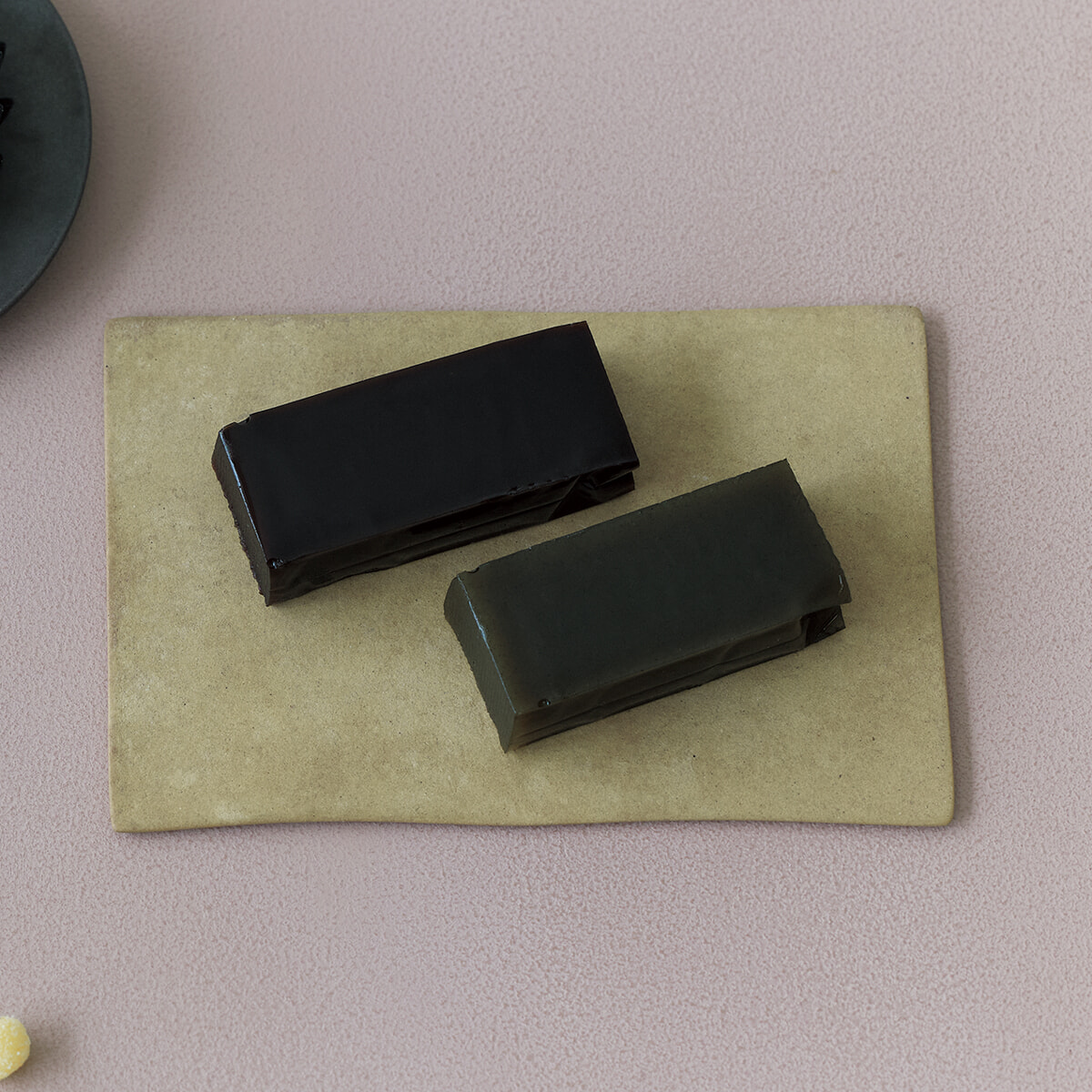 京都の銘菓”真盛豆”を手がける京菓子司金谷正廣とコラボレーション。ほうじ茶の香ばしさと金木犀の甘い香りが響く「焙じ茶+金木犀 羊羹」と、ほろ苦さが調和する「カカオ+オレンジ 羊羹」の2種のアソート。