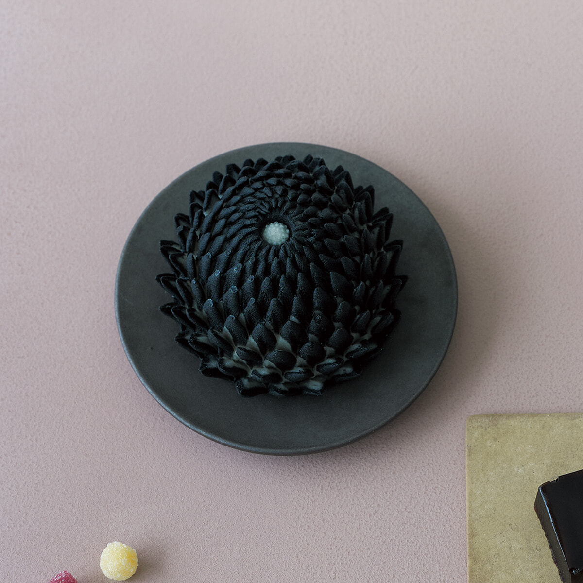 夢菓房たからの”はさみ菊”の技術を生かした黒の練り切りは、外の餡には檜と生ライム、中の白餡にはラズベリーとローズウォーターを練りこむ。