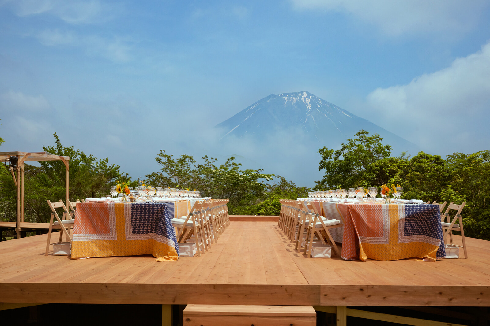 会場に着いたゲストたちを迎えたのは、ブランドイメージであるイエローの花々と、富士山と対面するように設えられたウッドデッキ、そしてロングテーブル。19世紀初頭に創設されたテキスタイルメーカー「ソレイアード」が手がけた、南仏の鮮やかなプリント生地のテーブルクロスが掛けられた。また同じ柄のレジャーシートの上にもマグナムボトルとグラスが無造作に配され、非日常感を演出してくれる。