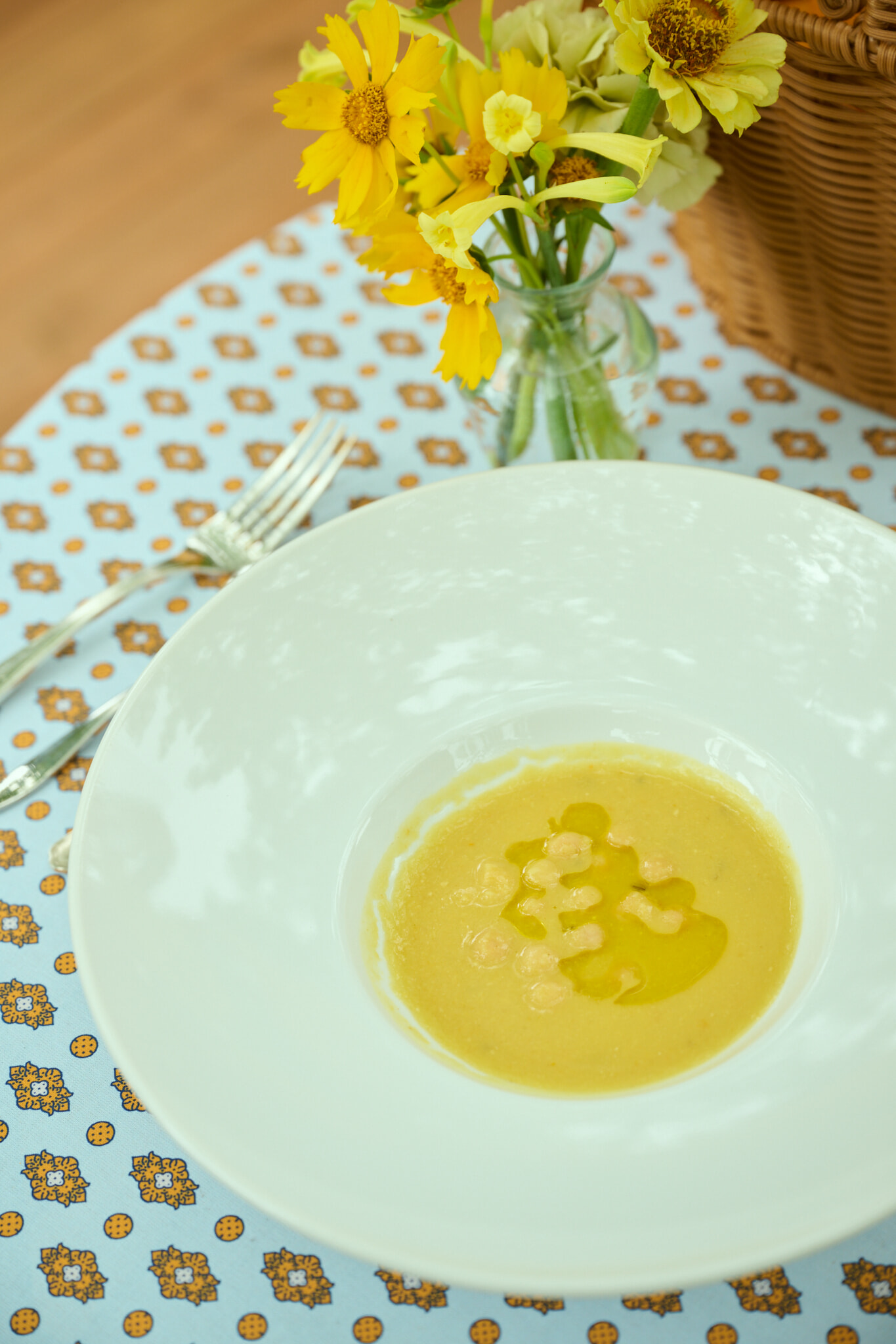 ひよこ豆のスープ。オリーブオイルを加えるという「味変」に、おかわりするゲストが続出。
