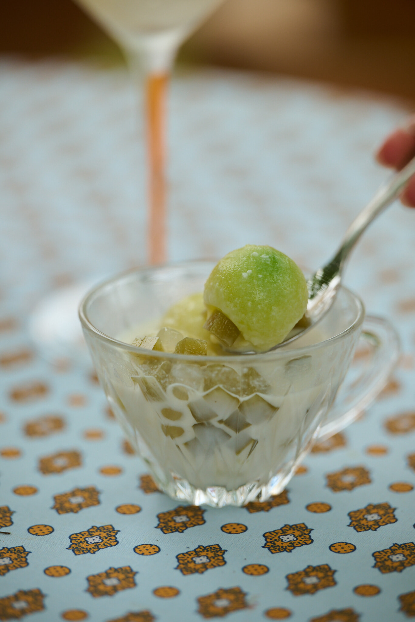 マスクメロン ココナッツミルク 茶寒天タピオカ。ロックにしたヴーヴ・クリコ リッチとの甘さの共鳴が心地よい。