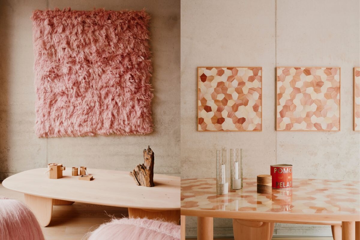 うってかわって、ふわふわで柔らかいピンク色でナチュラルなインテリアを提案したのは、メキシコ人アーティストでデザイナーのFernando Laposse(フェルナンド・ラポッセ)。トウモロコシの皮やリュウゼツランの繊維を使ったデザインを多く発表している彼は、107平米の無骨なメゾネットに、トウモロコシの皮を使ったモザイクの家具やリュウゼツランの繊維を使った生き物のようなオブジェが散りばめられ、遊び心あふれる空間となっている。