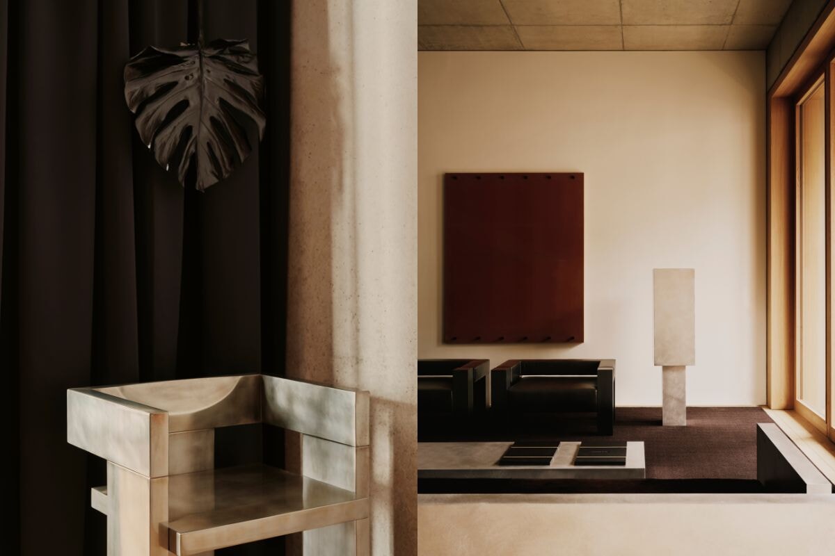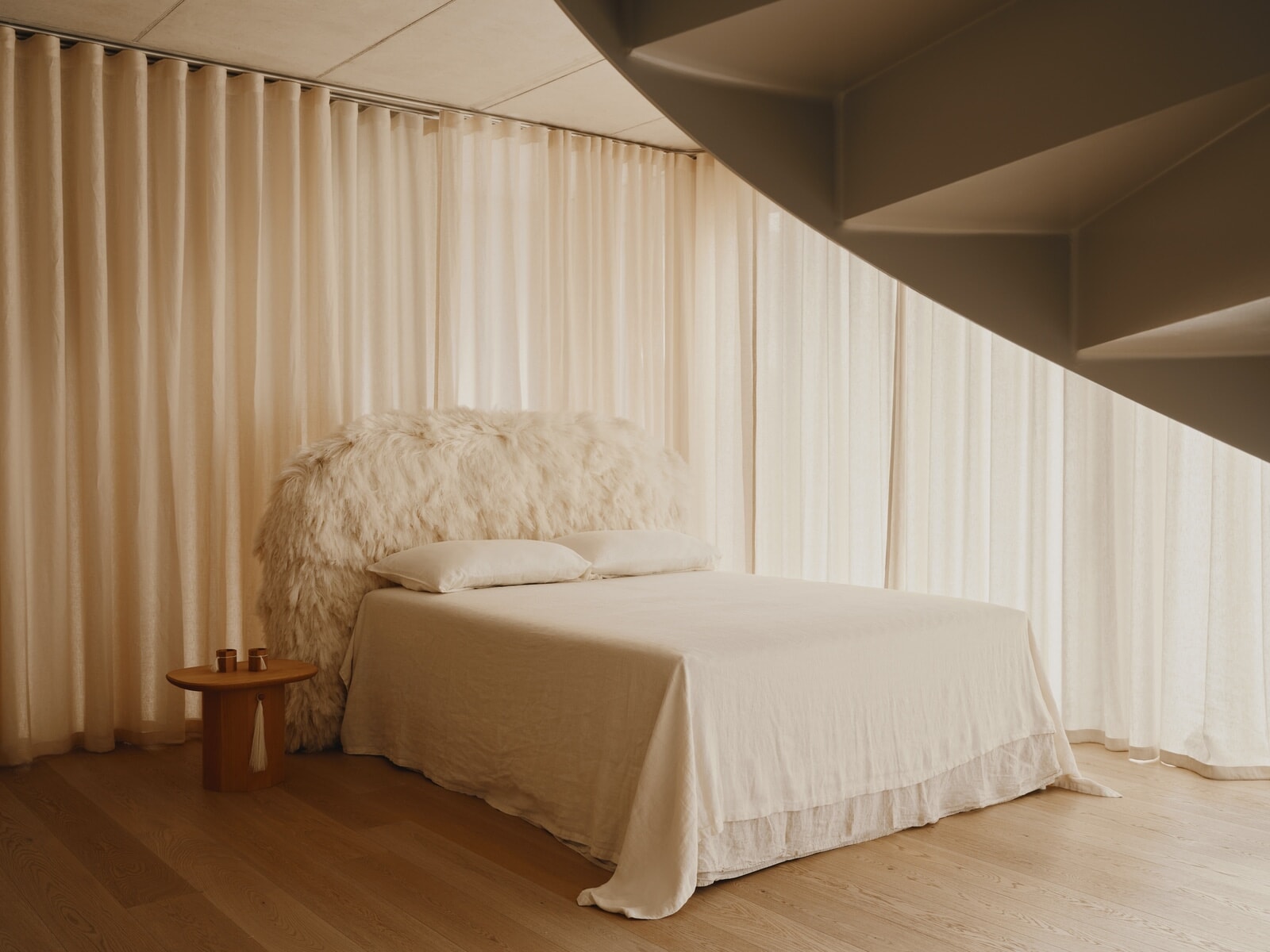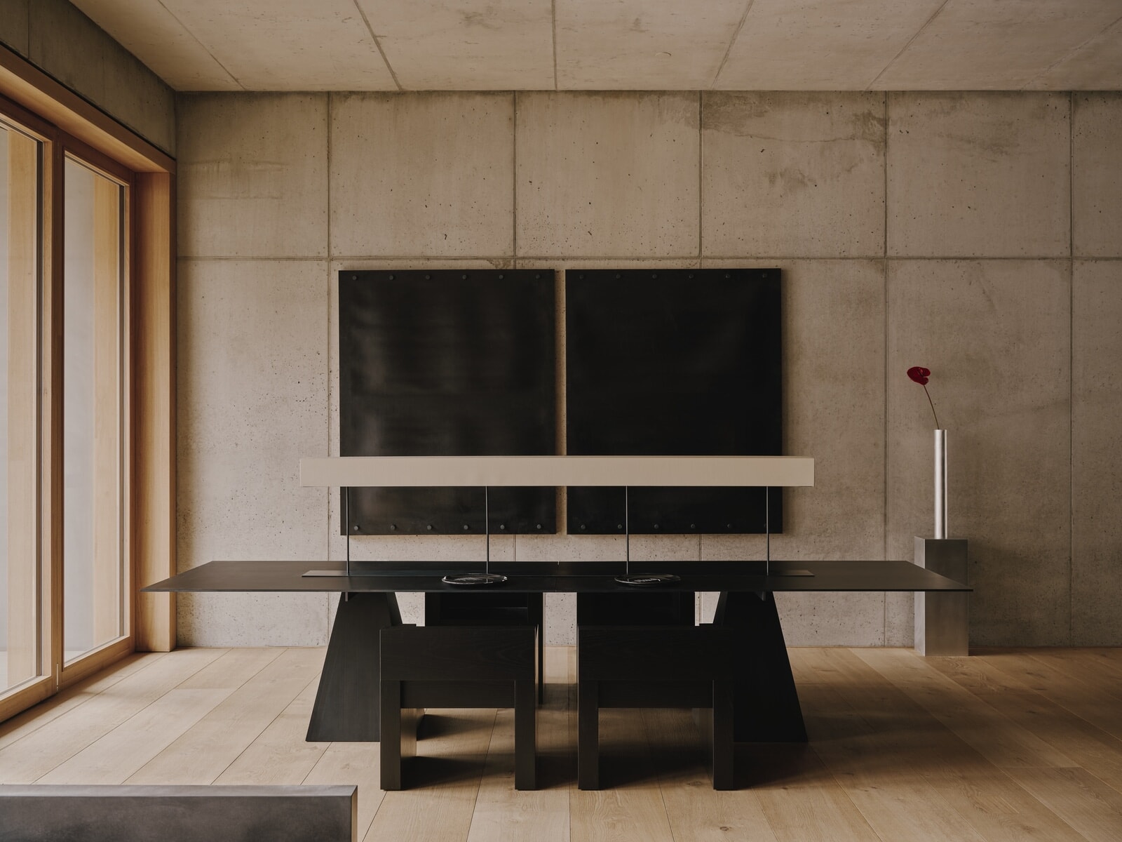 ヘルツォーク・ド・ムーロン自身が設計した146平米のロフト空間。そのインテリアを手がけたのは、ミラノ発のデザインユニット、Studioutte(ステュディオッテ)だ。打ち放しのコンクリート壁が印象的なブルータリズム建築の中に、ゴムや皮、鉄、毛足の長い絨毯やファーなど、官能的で強い素材感を持つ家具やオブジェを配置。キッチンや寝室などのスペースは真っ黒なカーテンで仕切ってあり、まるで劇場のようだ。