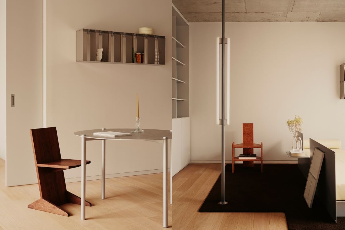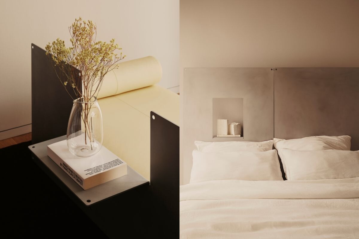 ベルリンに拠点を置くLOTTO Studio(ロット・スタジオ)がデザインしたのは、南向きのバルコニー付き、79平米のアパート。寝室とリビングキッチンの間にはスライドドアがあるが、そこを開けばワンルームのような造り。薄い金属の板を折り曲げて作ったベッドやソファなどの家具には、窓の外の風景や壁、天井の素材などを感じることができるよう、小さな穴が開いている。