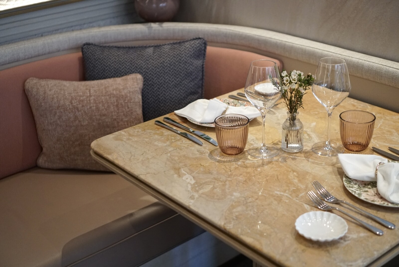 あらゆる角を排除したモデラのインテリアは安全性を意識しても、しなくても、スタイリッシュでロマンチックなムードも併せ持つ