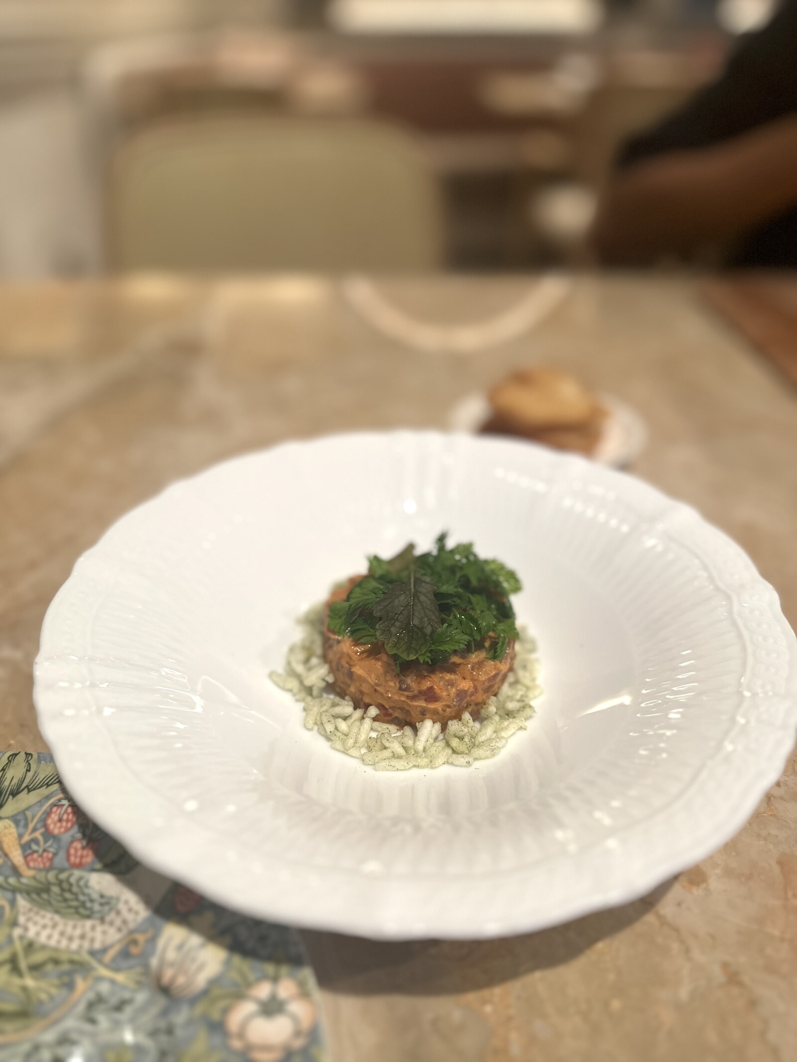 贅沢な「本マグロのタルタル、スペインのエスペレット唐辛子のマヨネーズと揚げライス添え」。チリの風味が最大限に発揮されていて辛味はほぼなく、安心して食べられる。258香港ドル
