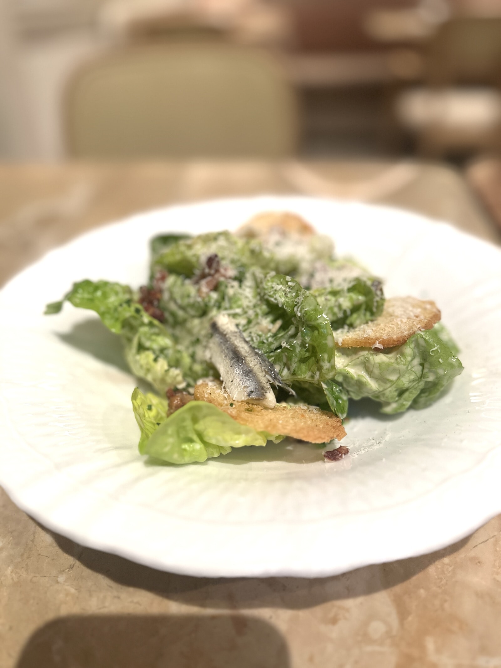 宝石のようなレタスという意味のジャムレタス、ダブルスモークしたベーコン、アンチョビなどを用いた特製シーザーサラダ、148香港ドル