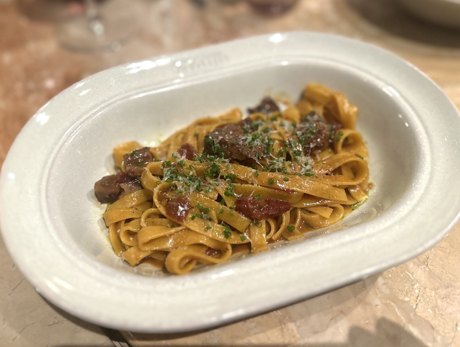 自家製タグリアテーレに、ビーフショートリブのラグーソースを合わせて、ネギオイルソースで味付きをして、フレーバーに変化を加えた特製パスタ。198香港ドル