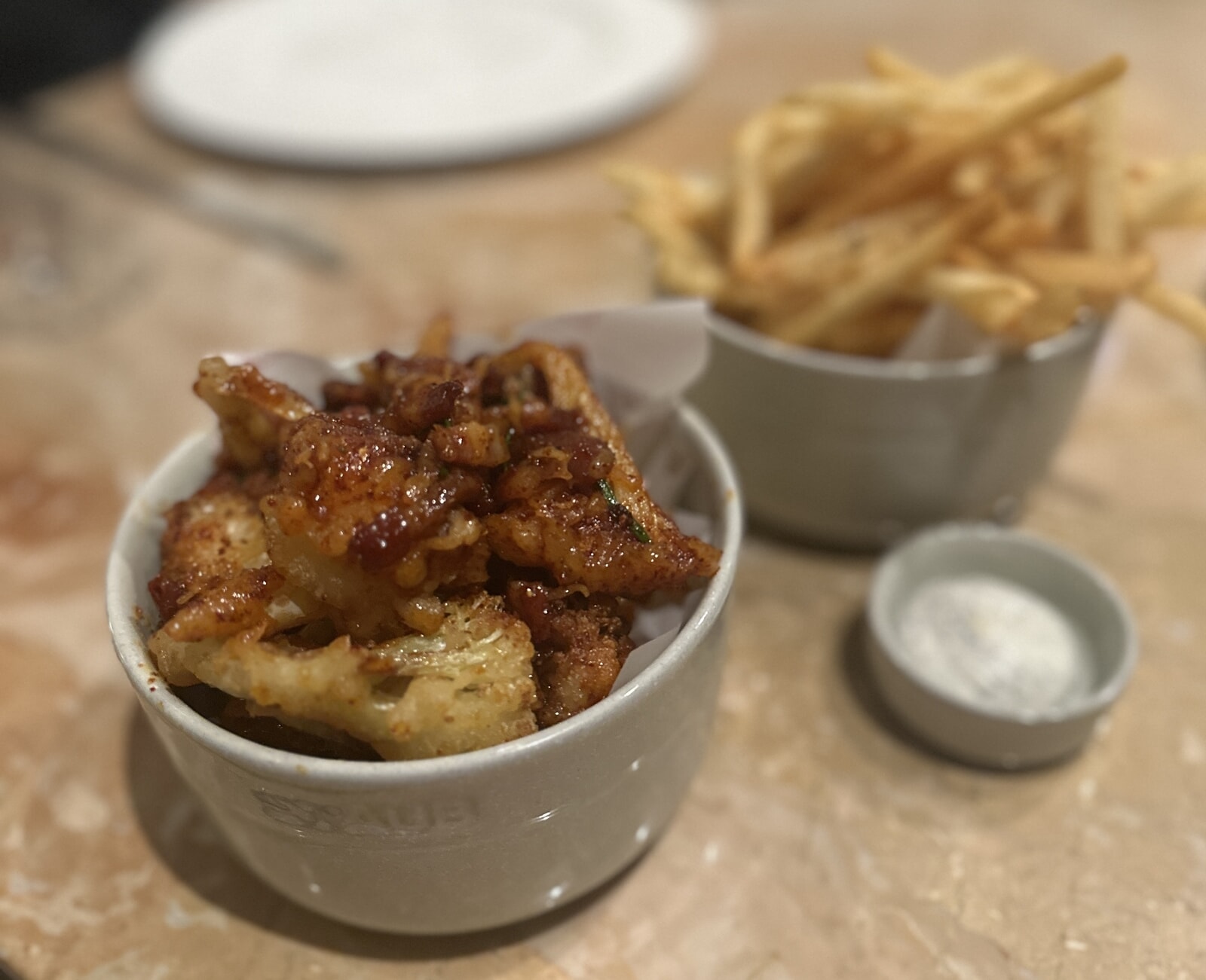 付け合わせの人気は、「クリスピーに仕上げたカリフラワーのホットハニーソースとダブルスモークベーコン和え」と、削ったパルメザンチーズと黒トリュフマヨネーズを添えた「トリュフフレンチポテト」の風味豊かなコンビ。各98香港ドル