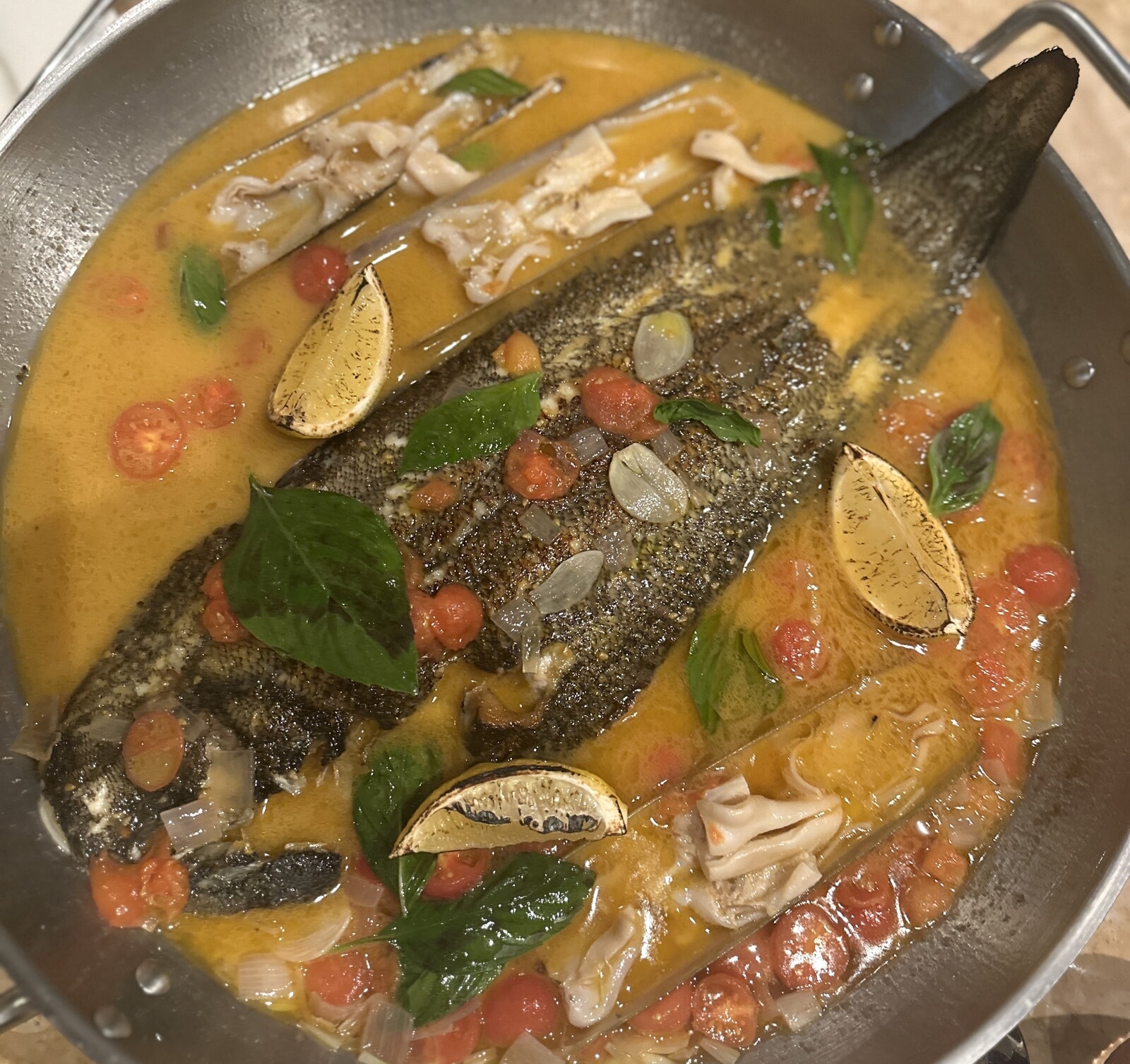 シェフが魚市場で仕入れてくる豪華なヒラメのローストは、チェリートマトとマテ貝を添えて。1288香港ドル(4人分)