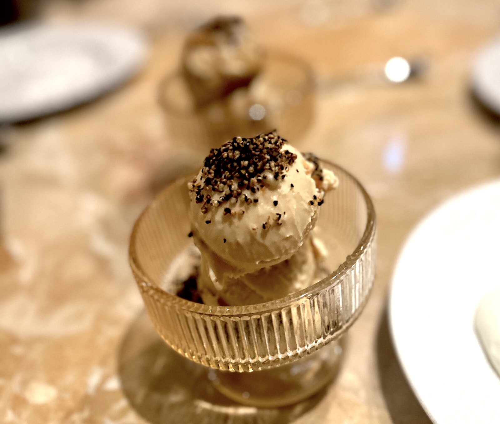 「アヒルの塩漬け卵とミルクジャム、黒キノアのジェラート」など、広東料理の影響を受けつつ誰からも愛される美味しさのヴィッキーならではのデザートもオーダーできる。58香港ドル