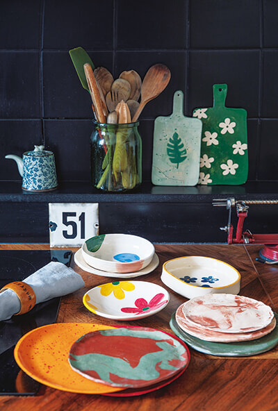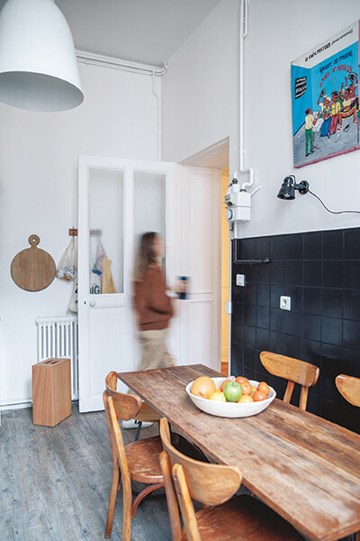 著名な建築家であるウージェーヌ・ヴィオレ=ル=デュックによる19世紀のアパルトマンに、家族とともに暮らすクレマンティーヌ。サンラザールで手掛けてきた空間デザイン同様に、住居にも出自の異なるオブジェを調和させて、物語のあるパーソナルなスペースを生み出している。その世界観はキッチンでも健在だ。古いものと現代デザインが同居するキッチンに並ぶのは、掘り出し物の食器、デザイナーもののコーヒーカップ、娘が制作した色とりどりの陶器など、思い入れのあるものばかり。クレマンティーヌの審美眼のもと集められた食雑貨が仲良くまとまり、温かなダイニングシーンを彩っている。