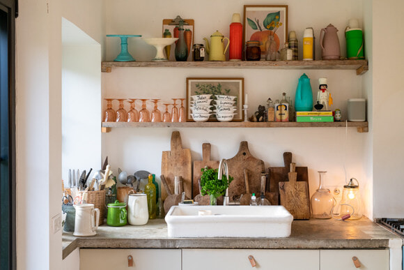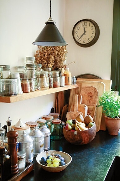 アールドゥヴィーヴルの暮らしを体現するインテリアデコレーターのゾエ。古きものと現代的な感覚のスタイルミックスを提案する彼女のノルマンディの別荘には、使い込まれた道具が随所にちりばめられている。やさしい光が差し込むキッチンには、木のカットボードやお揃いのグラス製品と一緒に、ヴィンテージの水筒、額、雑貨をディスプレイ。物でいっぱいなのにすっきり見せているのは、置き方に規則性をもたせているから。日常的に使うものはシンプルに統一しつつ、水筒や雑貨の多様な色や形でアクセントを作り出している。