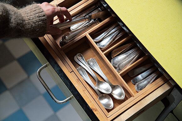 カミーユが生まれた時から1本ずつ、クリストフのシルバーのカトラリーが父方の祖母から贈られている。家族との思い出がつまった品に囲まれて暮らすのも、生粋のパリジェンヌならでは。