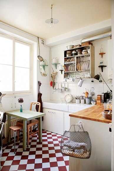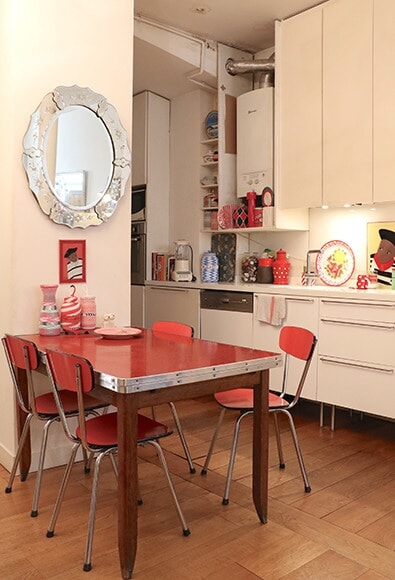 白いキッチンに置かれた赤いテーブルと椅子は、ヴィッド・グルニエと呼ばれるガレージセールで見つけたという。テーブルは15ユーロ、椅子は4脚9ユーロで入手した掘り出し物だ。壁には大好きなヴェネチアングラスの鏡を飾って。photography: Mariko Omura
