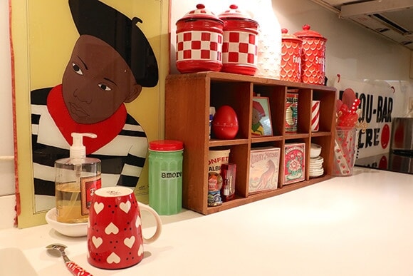 赤でまとめられたキッチン回りの雑貨とアート。キャニスターは、同種類のものを複数並べることで、統一感ある空間に。photography: Mariko Omura