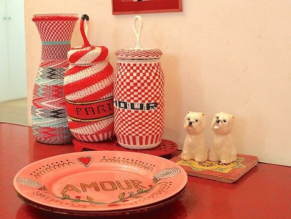 マレ地区にあるCSAO(サオ)は、セネガルの女性たちが刺繍職人として生活できるよう支援するフェアトレードブランドだ。布選びから刺繍のアイデアなどを担当するオンディーヌは、とにかく色が大好き。アフリカの色鮮やかなアイテムの中でも、主に赤とグリーンの雑貨を自宅用に選ぶ。そこにヴィンテージの家具をミックスさせることで、居心地のよい陽気な雰囲気を形作っている。キッチンは、スプーン1本に至るまで雑貨を赤でコーディネートするこだわりよう。料理が苦手で台所で過ごす時間はほとんどないという彼女だが、ここで家族と過ごす食事の時間は、笑顔あふれるものになっているはず。