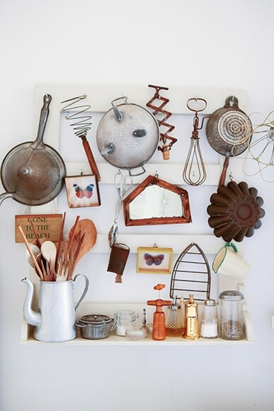 ウォールシェルフに飾った古いキッチン道具は、出合った時にひとめぼれ。棚全体がひとつのアート作品であるかのよう。