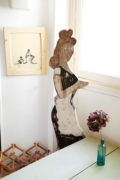 ノルマンディの蚤の市で見つけた木のオブジェは、カフェの看板に使われていたもの。壁に飾られた叔父のイラスト作品とともに、味わい深い存在感を放つ。