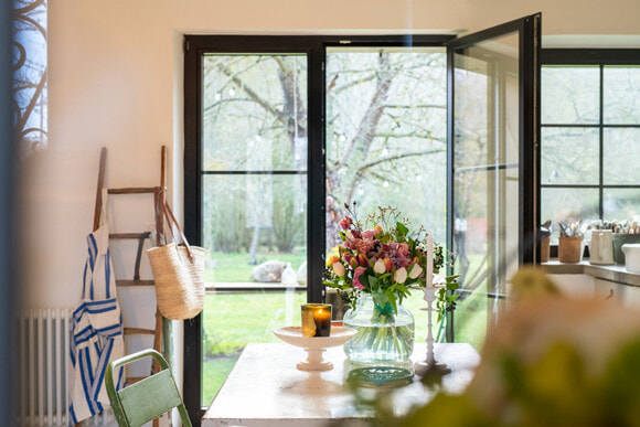 庭を眺める、玄関正面のキッチン。季節の花、かごバッグ、ストライプのエプロンなど、置かれてあるもののひとつひとつに美が宿る。