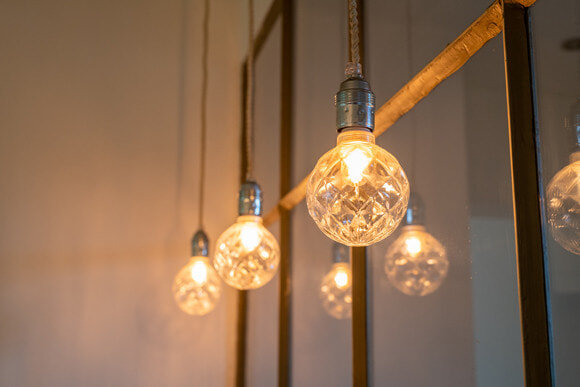 キッチンで使われている「zangra」の照明。日が落ちると、カットが施された裸電球からニュアンスのある温かな光が点される。