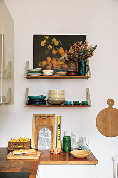 出身地のレバノンや地中海料理にインスパイアされた多国籍な料理を得意とするジュマナ。オスマン建築のアパルトマンである自宅のキッチンも同様に、ヨーロッパやアフリカ、アジアから集めてきた調理器具や器、雑貨を配して、心地よい空間をつくりあげている。料理家だけに、広い作業台やたっぷりの収納スペースに目を奪われるものの、すべてを隠すのではなく、鍋やティーポットは棚にディスプレイ。壁面にはマグネットスタンドを設置し、包丁などの調理道具ホルダーにしているが、これも見せる収納テクニックのひとつ。使いたい時にさっと取れるよう、実用的な工夫を凝らしているのがジュマナ流だ。