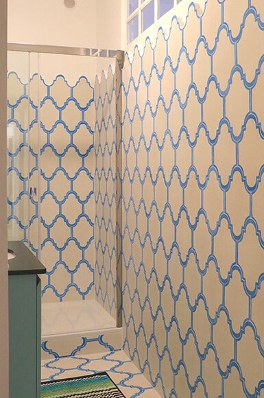 コンテンポラリーな幾何学模様が特徴のPophamのタイルが、シャワールームにもぎっしり。セメントタイルは、耐久性があり機能的でも優れている。photography: Mariko Omura