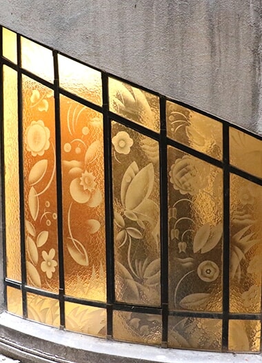 バスルームの窓に組まれたアールデコのガラスに、1930年代の建築物である名残りが見られる。photography: Mariko Omura