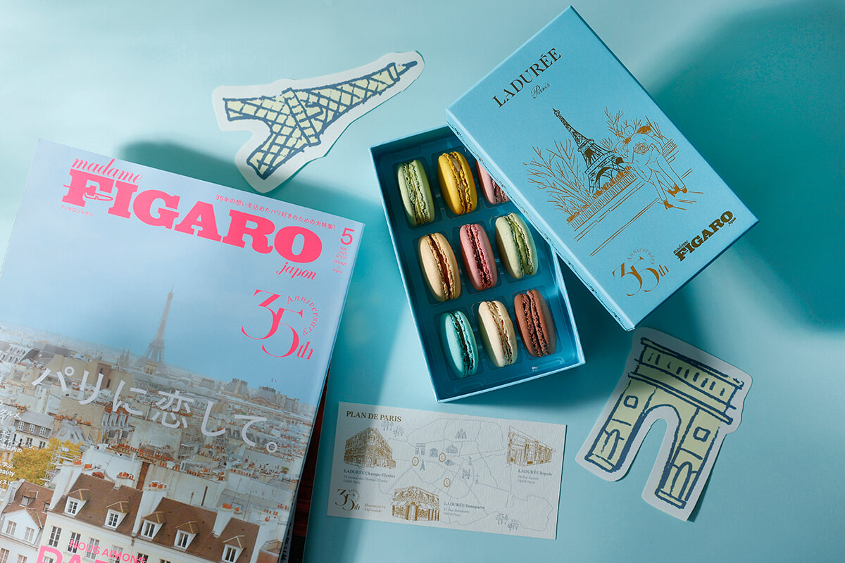 8月2日(土)〜9月30日(火)の期間は、フィガロと同じパリ生まれの老舗パティスリー、ラデュレとコラボレーション! ラデュレ 日比谷店にて、フィガロジャポン35周年アニバーサリー アフタヌーンティーやパティスリーをメニュー展開するほか、全国のラデュレ ブティックやオンラインショップでは、限定のマカロンボックスとトートバッグを販売。