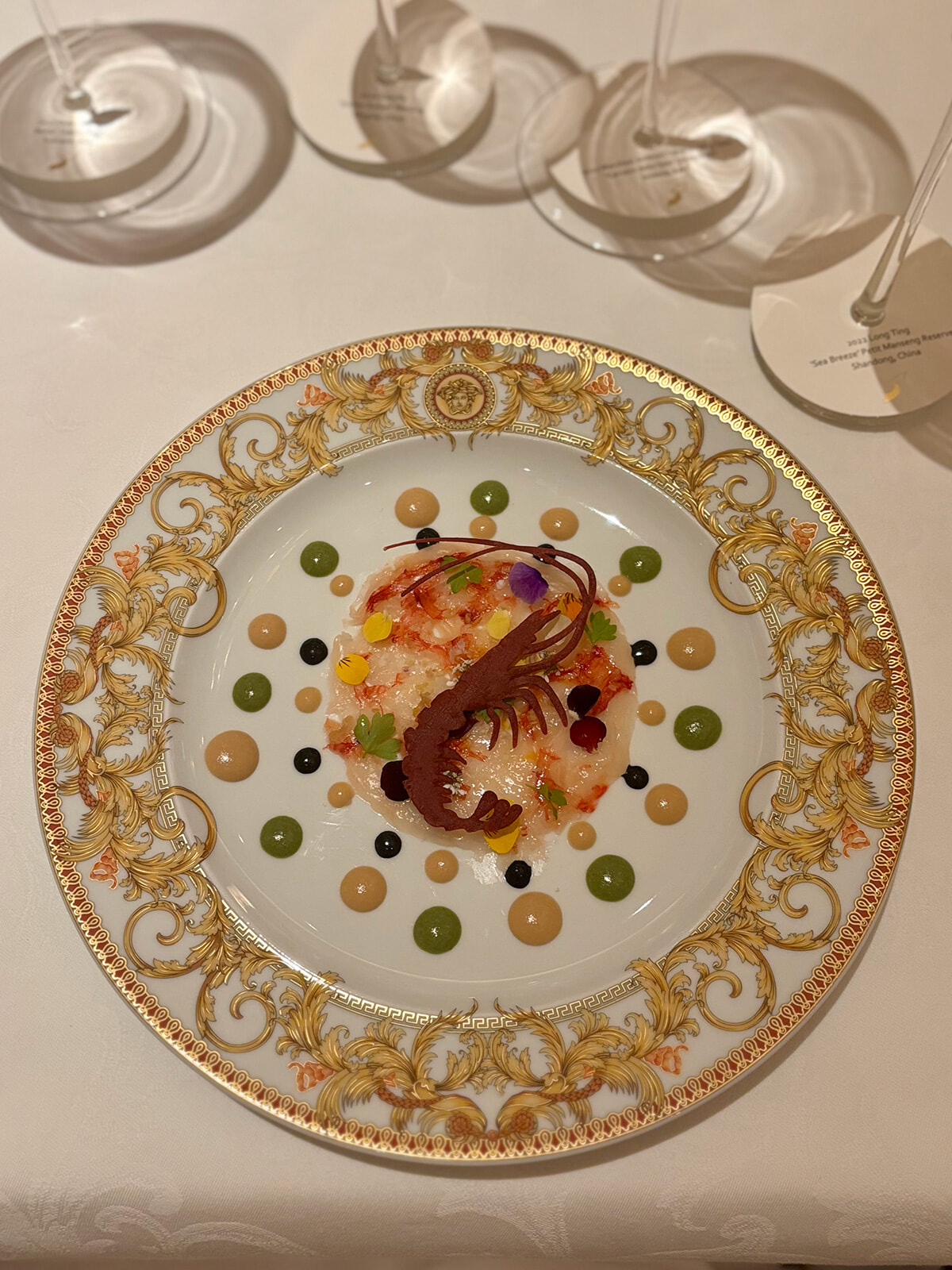 冷前菜の「Gambero」。緑のソースはワサビ。黒いソースは豆醬。エビ殻から作ったクラッカーを上にのせて。お皿はもちろんヴェルサーチェ。
