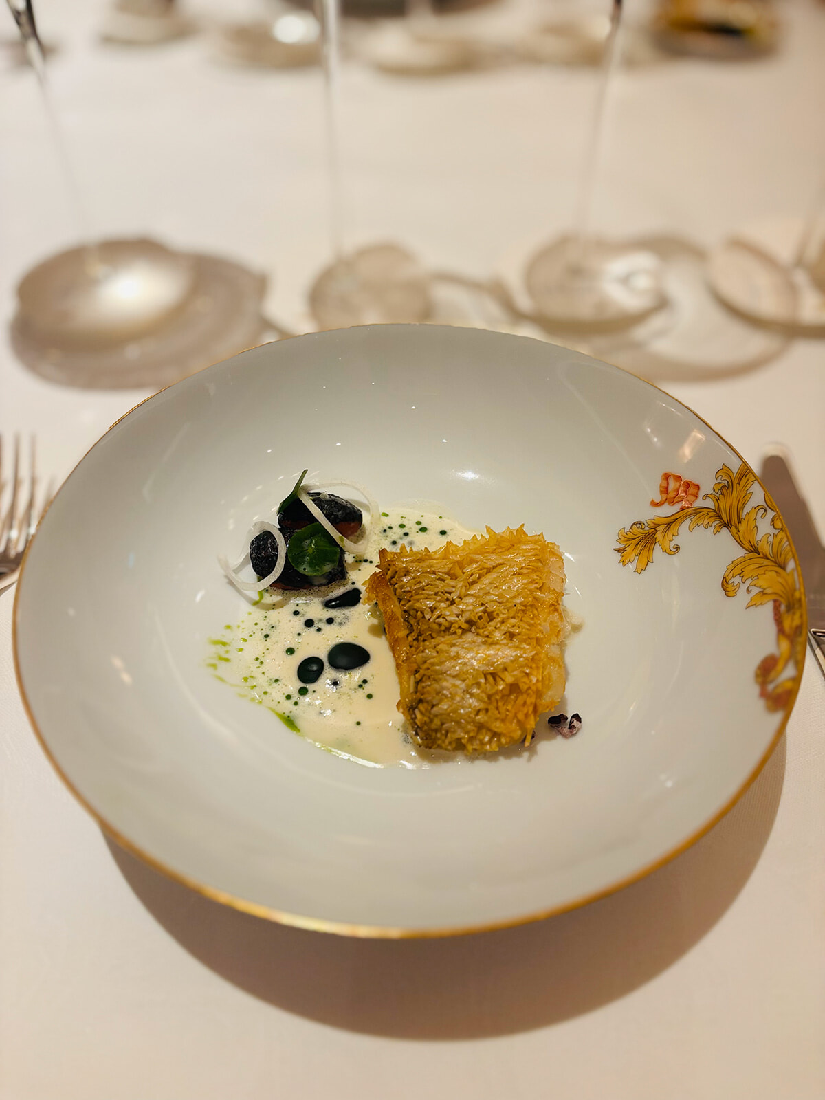 その後に供された魚料理は荒井シェフとプッチシェフによるもの。その名も「Amadai」。見事な鱗焼きに、ゲストからは感嘆の声も。甘鯛の優しい甘さに貝のブイヨンが味に奥行きを与え、さらに甘鯛の下に潜んだ米のパフが食感も楽しい仕上がりに。