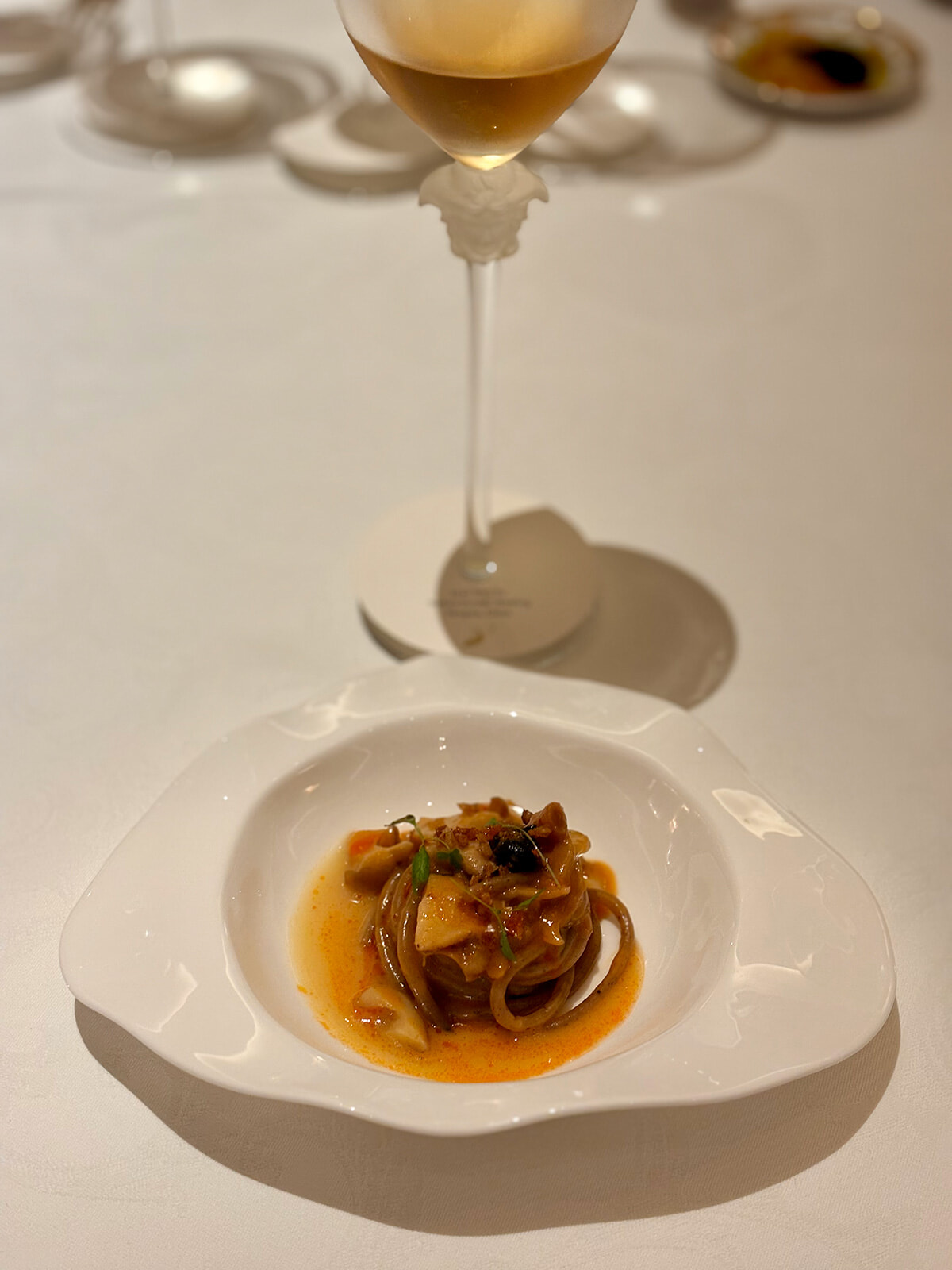 続いてプッチシェフによる、低温調理で仕上げたオマールブルーとアーティチョークの前菜が登場し、そのあとはプリモピアットの「Pici」。こちらはプッチシェフとセブンシェフの共作。手打ちのピチのもっちりとした歯触りもさることながら、15年熟成の陳皮を使っているのが興味深いところ。巻貝のサクっとした食感もアクセントに。