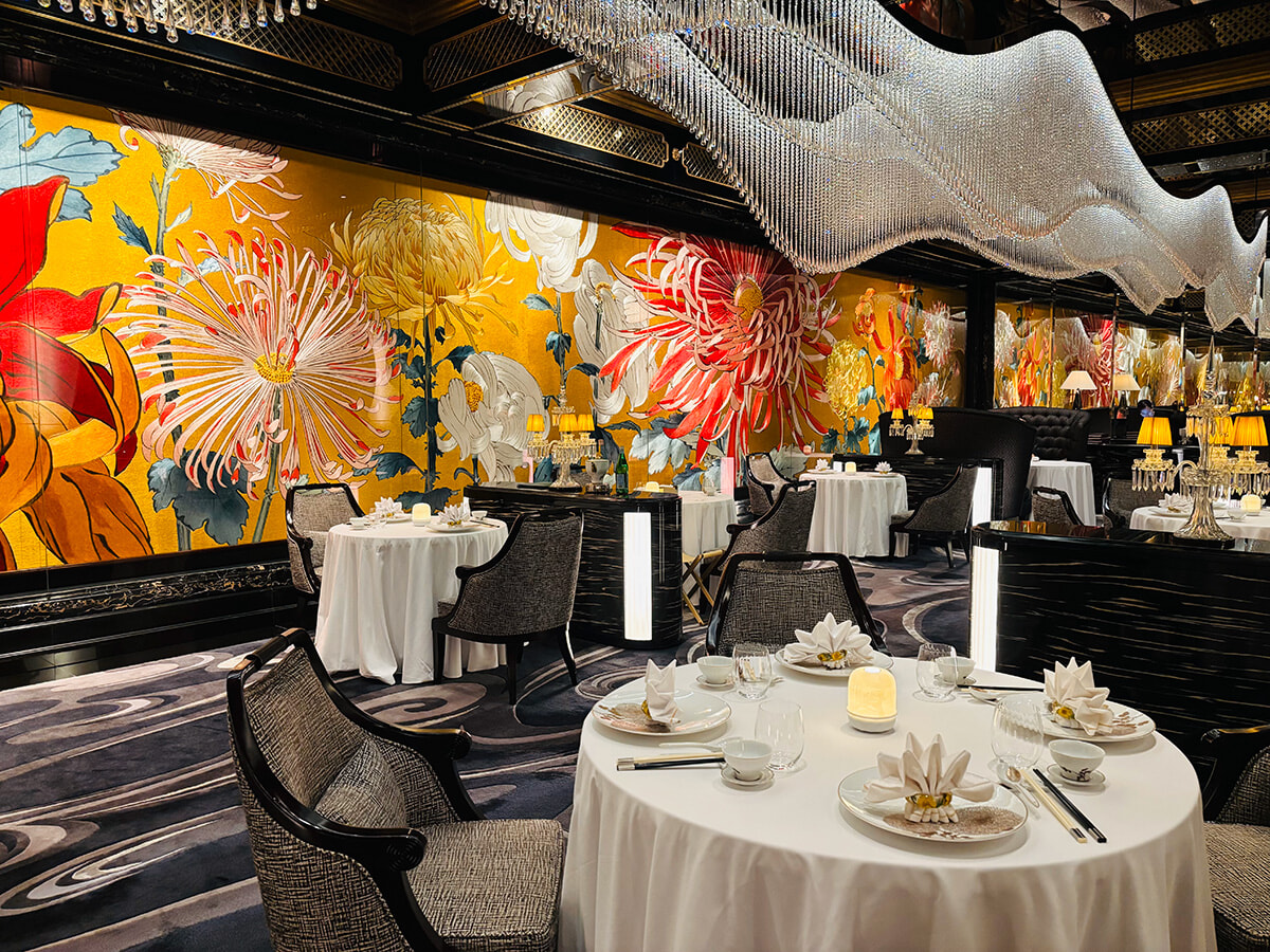 そのひとつが広東料理を供するパレス ガーデン。緑に囲まれたエントランスから、35メートルの巨大な蘇州刺繍が迎えるダイニングまで、大胆かつリュクスなインテリアが目を引く。内装は香港人デザイナーのアラン・チャン。世界的に活躍する香港を代表するデザイナーで、三井住友銀行のロゴやラ王のパッケージを手がけるなど、日本との関係も深い。