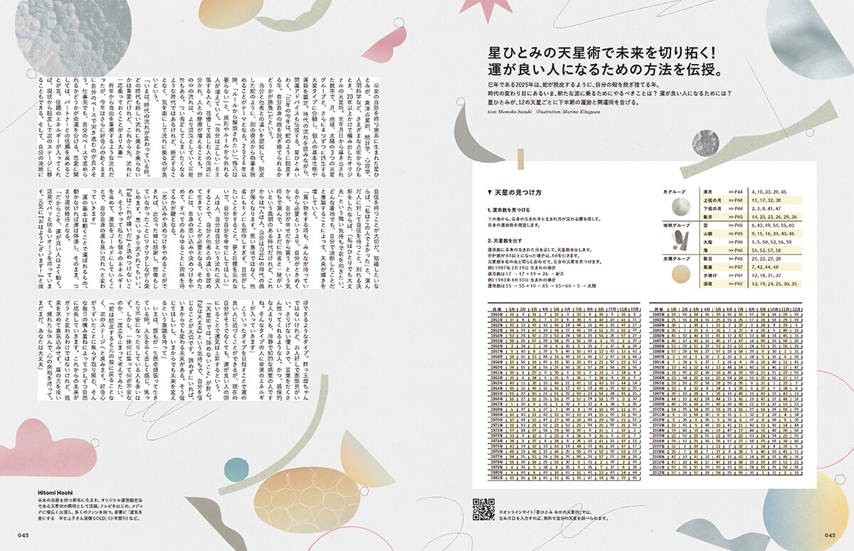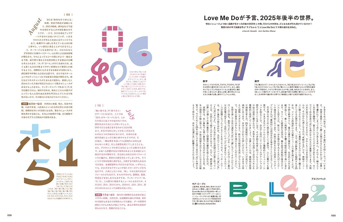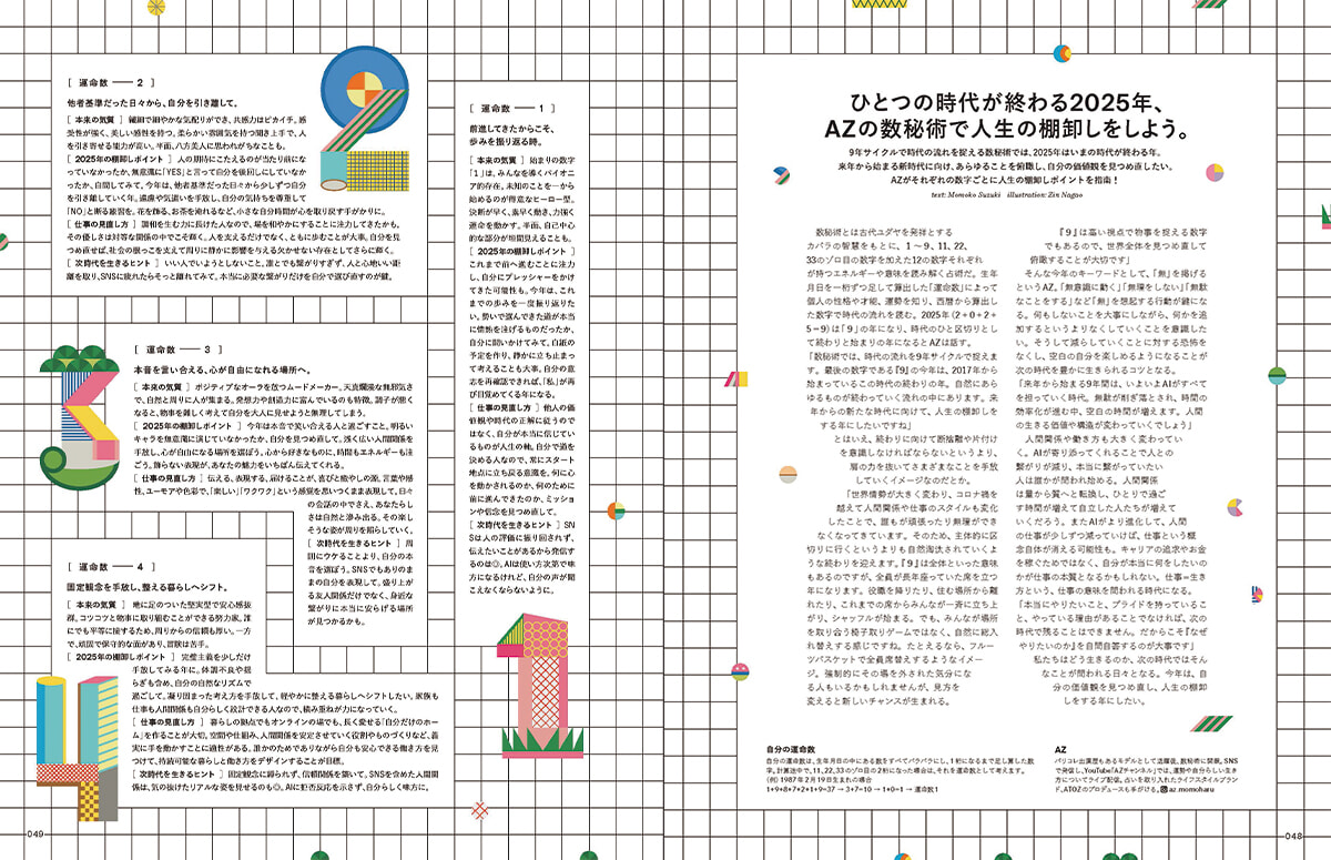 道枝さんを占ってくれたAZさんによる数秘術のページも。運命数を割り出して自身を知る数秘術ですが、今年2025年はイヤーテーマも道枝さんの運命数と同じ「9」が鍵です。