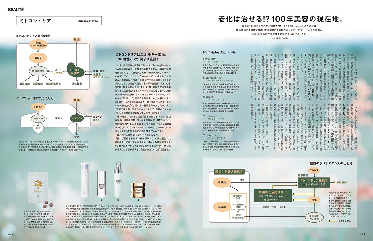 美容テーマはフィガロジャポンの2大テーマのひとつ、100年美容。人生後半の長い期間、健やかに美しく在るには知恵が必要です。現在のトレンドは、「細胞」。