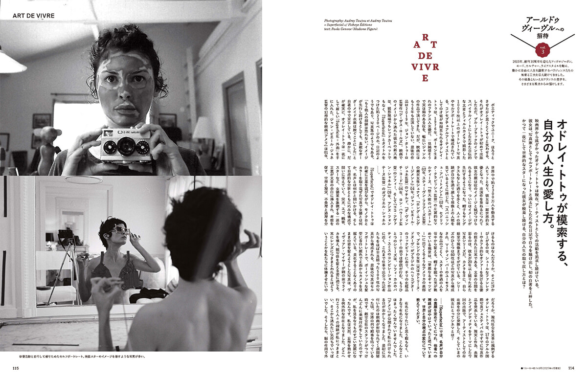 「占いで私を知る。」特集号にぴったりな集中連載「アールドゥヴィーヴルへの招待」の今回のテーマ。フランス人俳優のオドレイ・トトゥが、映画界で演じることから少々距離を置いて自分自身を見つめ直していった軌跡についてのインタビューです。巻頭の特集内には鏡リュウジさんのジャーナリングに関する記事があるのですが、このオドレイ・トトゥの道筋はまさにジャーナリング的でもあったと思います。