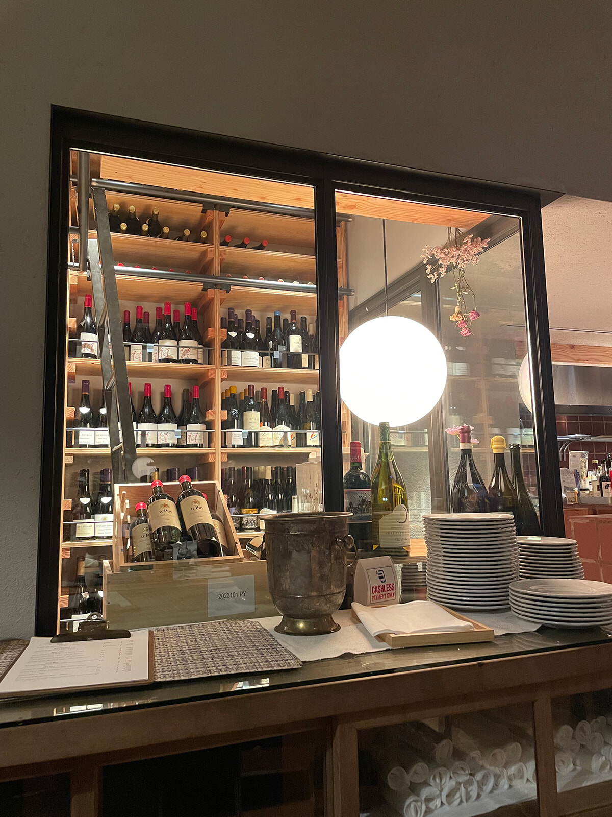 テーブル席から撮影したワインセラー。フランス、イタリアを中心にインポーター・テラヴェールが輸入したさまざまな生産者のワインが揃う。