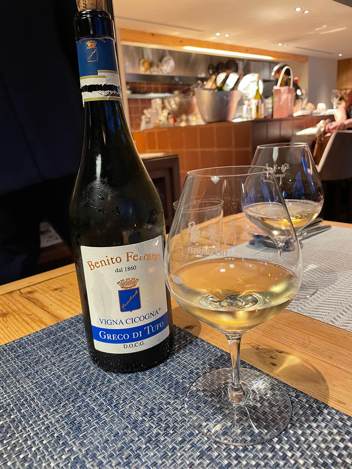 まずはグラスの白ワインで暑さを忘れよう! 南イタリア・カンパーニャ州のグレコ・ディ・トゥーフォで乾杯。