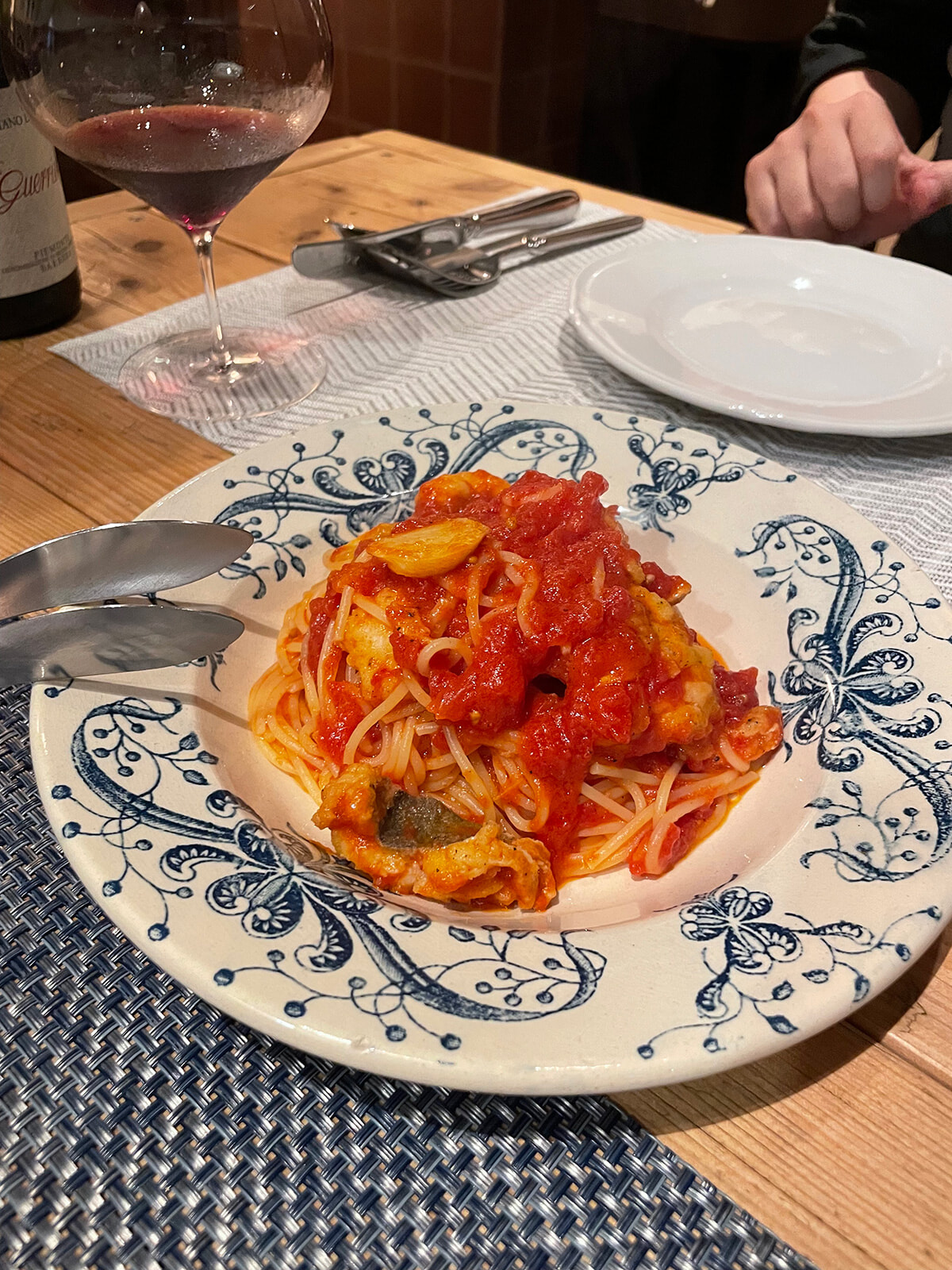 なんと、シェフは僕の地元であるカザーレ・モンフェッラートで数年間、働いていたそう! この話を聞いた後に、微発泡のバルベーラとアラビアータへ。その組み合わせは、僕にとって未知の扉を開いてくれるかのようだった。