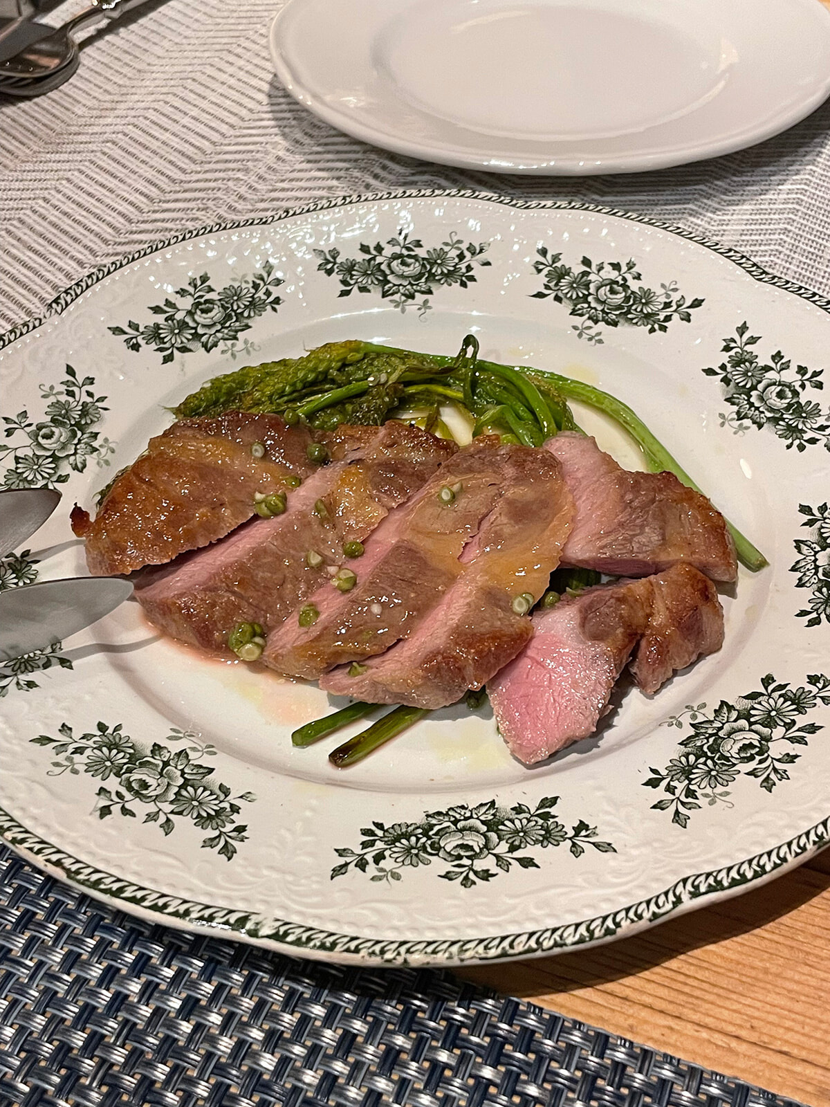 厚めにスライスされた豚肉の下には旬の緑野菜がたっぷりと敷かれていて、肉のジューシーさと野菜のフレッシュさを一緒に楽しめる、食欲をそそるメインディッシュだった。ハード系のパンと組み合わせて楽しんでいる僕の前で、バルベーラが料理の案内をしてくれているような気分になった。