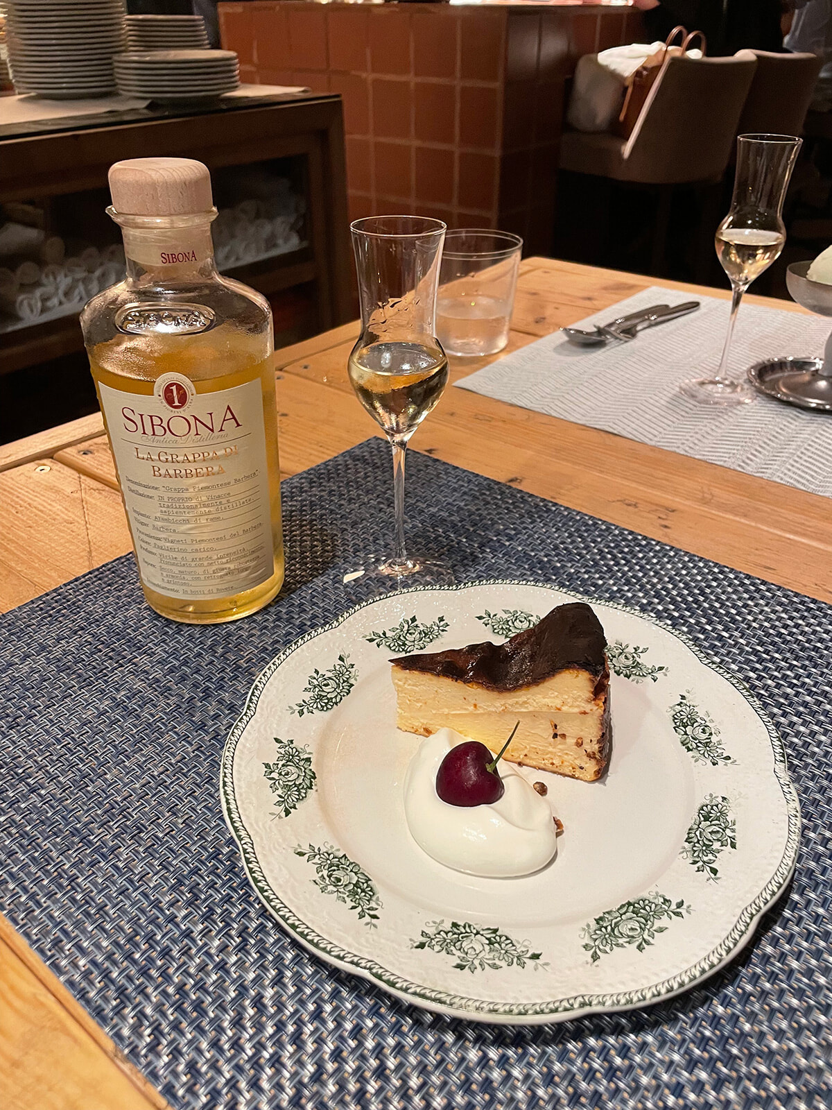 これ以上の料理と楽しさがないと思いきや、ピエモンテ人に欠かせないバルベーラのグラッパが、濃厚なバスク風チーズケーキと共に挨拶しにきてくれたのだ。バルベーラのグラッパとチーズケーキの甘さが合う理由は、グラッパの辛口で熟成感がある味わいとチーズケーキの少し酸味のある甘さがマッチするから。このグラッパは長く続く力強い後味が特徴で、オーク樽で熟成されている。
