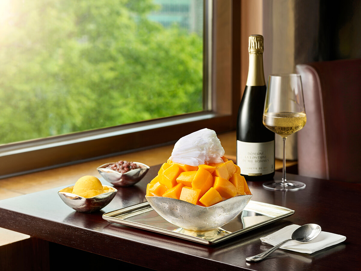 口溶けが良いと評判のふんわりミルク氷がベース。ホテルのソムリエが厳選したワインやウイスキーとのペアリングも可能で、マンゴーの甘みをより引き立てる贅沢さが人気。今年の提供は8月31日まで。マンゴーピンス 110,000ウォン ワインセットペアリング 132,000ウォンから