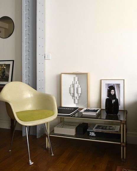 ロンドンのアートスクールに留学後、パリに戻ってモードを学び、現在はアートキュレーターとして活躍するエミリー。プライベートでもアートに囲まれたモダンな暮らしを楽しんでいる。壁際の一角に置いたイームズチェアは、パリのオークションで購入したもの。ガラスのテーブルには多重構造のペーパーアートとして知られるwell well designersの作品や、オラファー・エリアソンの作品集を飾って、アーティスティックなムードを演出している。