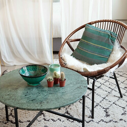 グリーンを効かせたサロンは、モロッコから持ち帰った敷物や器、バリ島の布のクッションなど、エスニックなテイストがアクセントに。